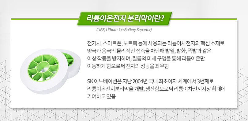 산업 보국, 기술 독립의 꿈으로 달려온 각 관계사들의 수많은 기술 중 1번 타자로 언급된 것은 SK이노베이션의 소재사업 자회사인 SK아이이테크놀로지의 LiBS(리튬이온분리막, Lithium-ion Battery Separator)! 딥 체인지(Deep Change)를 통해 글로벌 시장을 선도하고 있는 SK그룹 관계사들의 쟁쟁한 기술들 가운데서도 맨 앞자리에 선 LiBS는 대한민국 부품소재 국산화의 대표주자로 꼽히고 있다. 전기차, 스마트폰, 노트북 등에 쓰이는 2차전지의 핵심을 이루는 SK이노베이션의 LiBS, 그 놀라운 기술력과 차별적인 경쟁력을 소개한다.