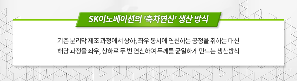 SK아이이테크놀로지의 LiBS 성장이 예상되는 이유는 독자적인 기술력을 확보하고 있기 때문이다. SK아이이테크놀로지는 2007년, 세계 최초로 ‘축차연신공정’ 기술을 개발했다. 이 기술을 통해 두께가 아주 얇은 분리막을 균일한 품질로 생산할 수 있게 됐다.