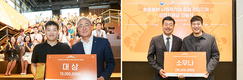 ▲ (좌측) 2019년 8월 진행된 ‘환경분야 사회적기업 창업 아이디어 공모전 시상식’에서 SK이노베이션 김준 총괄사장(오른쪽)과 소무나 송종원 대표(왼쪽)이 기념촬영을 하고 있다. / (우측) 2019년 11월 진행된 ‘환경분야 사회적기업 창업 아이디어 성장지원금 전달식’에서 SK이노베이션 배터리사업 지동섭 대표(왼쪽)와 소무나 송종원 대표(오른쪽)이 기념촬영을 하고 있다.
