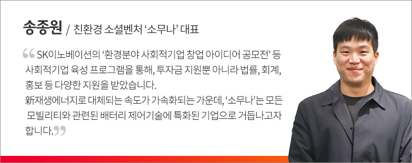 그런 와중에 ‘소무나’에게 기회가 찾아왔다. 지난해 5월, SK이노베이션과 환경부가 환경 문제를 해결하는 사회적기업을 육성하기 위해 개최한 ‘환경분야 사회적기업 창업 아이디어 공모전’에 참가하게 된 것이다. ‘소무나’는 ’無시동 차량 배터리 전장제어 시스템’으로 공모전에 참가한 전체 130여 개 업체 중 당당히 대상을 차지했다. 이후 ‘소무나’는 SK이노베이션의 성장지원금을 통해 초도 물량 제작에 성공했으며, 마침내 올해 하반기 상용화를 앞두고 있다.