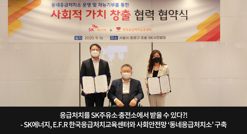 이를 위해 SK에너지는 9월 16일, SK서린사옥(종로구 소재)에서 ‘E.F.R 한국응급처치교육센터(이하 한국응급처치교육센터)*’와 ‘직영주유소와 충전소 내 동네응급처치소 운영 및 재능기부 활동을 위한 업무협약식’을 개최했다. 이 자리에는 SK에너지 오종훈 B2C사업본부장과 한국응급처치교육센터 박금옥 센터장, 한국응급처치교육센터 고문을 겸임하고 있는 더불어민주당 이상민 의원 등 행사 관계자가 참석했다.