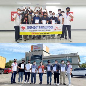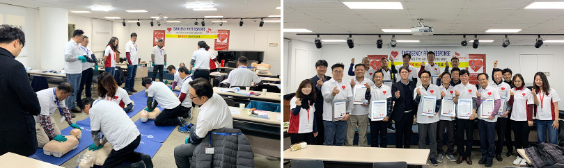 ▲ 지난 2019년, 부산 지역 SK주유소 및 충전소를 대상으로 진행된 심폐소생술(CPR) 교육(좌)과 E.F.R 자격 취득 수료식(우)