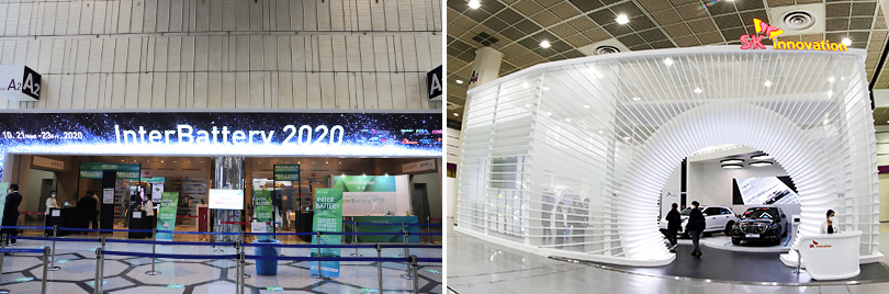 ▲ (좌) 인터배터리 2020 전시관 입구 / (우) 인터배터리 2020에 참가한 SK이노베이션 부스 외관