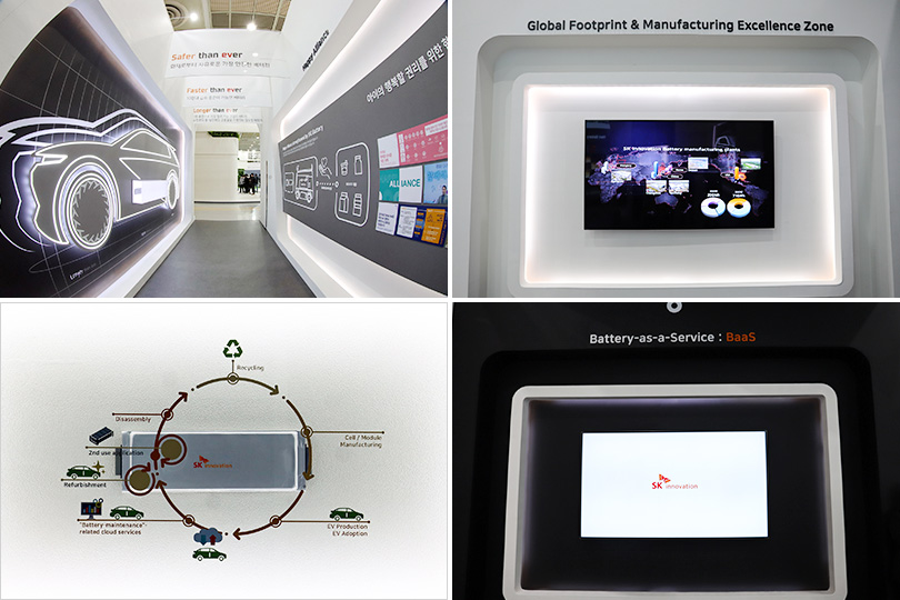SK이노베이션 부스는 ▲SK이노베이션 전기차 배터리 사업의 역사와 주요 성과 ▲글로벌 파트너십 ▲넥스트 배터리 및 차별화된 배터리 기술 ▲글로벌 사업 주요 성과 및 제조 공정 ▲BaaS (Battery as a Service)를 통한 미래 에너지 순환경제 청사진 ▲배터리 사업과 연계한 사회적가치 등 총 6개의 주제로 구성됐다.