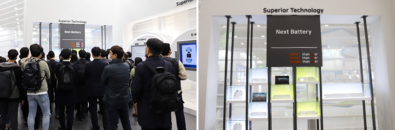 ▲ (좌) 인터배터리 2020 방문객들이 SK이노베이션의 넥스트 배터리를 관람하고 있다. / (우) 인터배터리 2020에서 선보인 SK이노베이션의 넥스트 배터리