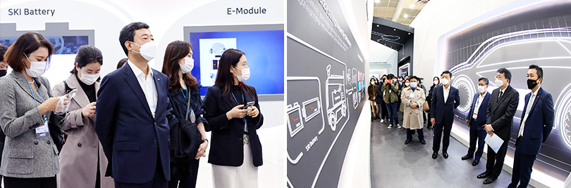 ▲ (좌) SK이노베이션 부스를 둘러보고 있는 SK이노베이션 배터리사업 지동섭 대표(가운데)