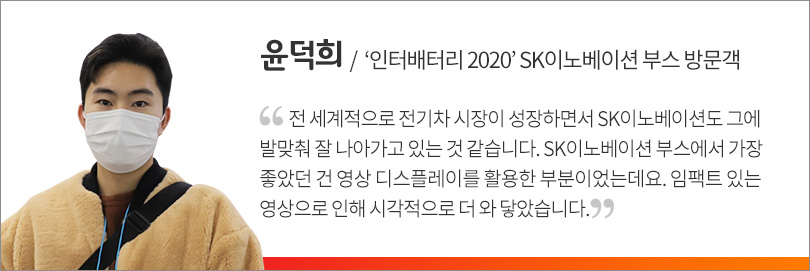 더불어 E모빌리티, ESS(Energy Storage System, 에너지저장장치)와 같은 전기저장관련 설비 등에 들어가는 배터리의 특성상, 전시 또한 고객과 시장에 대한 신뢰와 배터리를 사용하는 산업 발전에 기여할 수 있다는 점을 부각했다. 이는 올해 초 열린 ‘CES 2020’을 통해 공개한 ‘SK inside’ 전략과 같은 취지로, SK이노베이션의 배터리가 소비자들의 선택의 기준이 되도록 하겠다는 의지를 담았다.