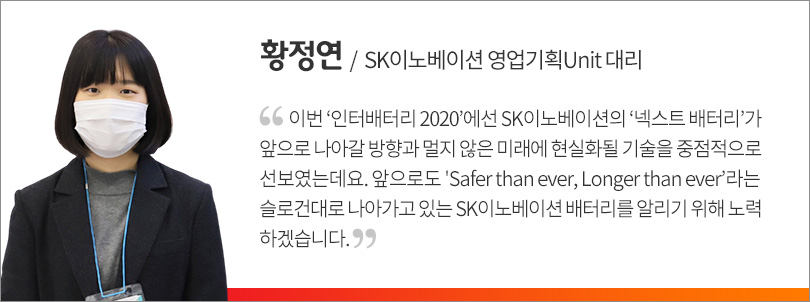 이번 ‘인터배터리 2020’에서 SK이노베이션은 업계 최고의 안전성과 첨단 기술을 보유한 배터리 기업으로서의 위상을 확실하게 전달하기 위해 ‘보다 안전하고, 보다 빠르고, 보다 오래가는(Safer than ever, Faster than ever, Longer than ever)’을 전시 슬로건으로 정하고, SK이노베이션이 추구하는 ‘넥스트 배터리’를 소개했다. 특히, 배터리와 관련해 가장 중요한 ▲화재 등으로부터의 안전성 ▲고속 충전 속도 ▲장거리 주행 등 차별적 우위를 확실히 보여줄 수 있는 3대 요소를 중점적으로 다뤘다.