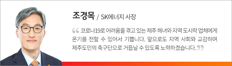 이를 위해 SK에너지와 제주UTD는 2월 25일, 제주특별자치도 및 제주해녀협회와 업무협약(MOU)을 맺고 고령 은퇴 해녀를 대상으로 ‘한끼 나눔 온(溫)택트’ 활동을 펼친다. 이번 활동은 총 20주간 진행될 예정이며, 일부 취약계층의 제주 해녀들을 직접 찾아 행복의 온기가 담긴 도시락과 마스크를 전달할 계획이다.