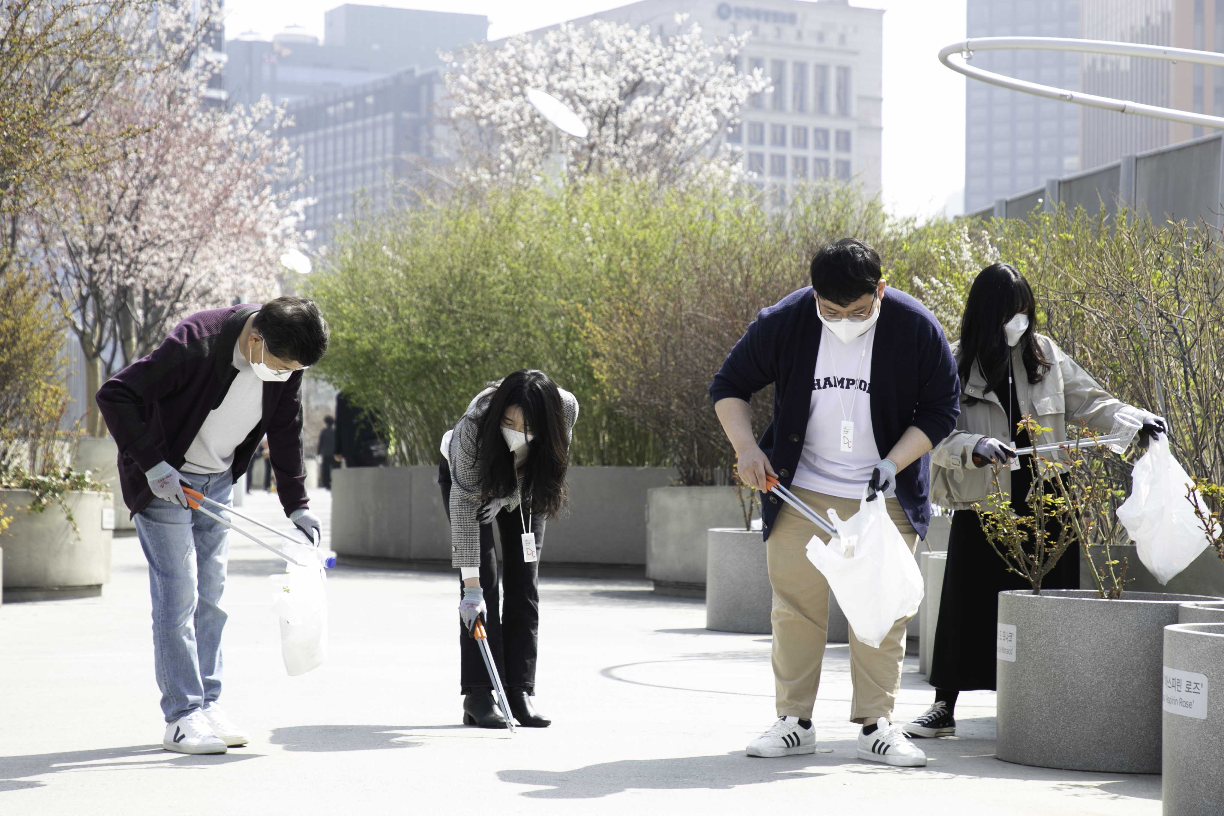 나 사장과 신입사원 및 회사 구성원들은 이날 오전 만리동광장에서 모여 서울로전시관, 회현역, 남대문시장, 북창동 먹자골목 등을 함께 걸으며 폐플라스틱과 담배꽁초 등 길에 버려진 쓰레기를 수거했다.