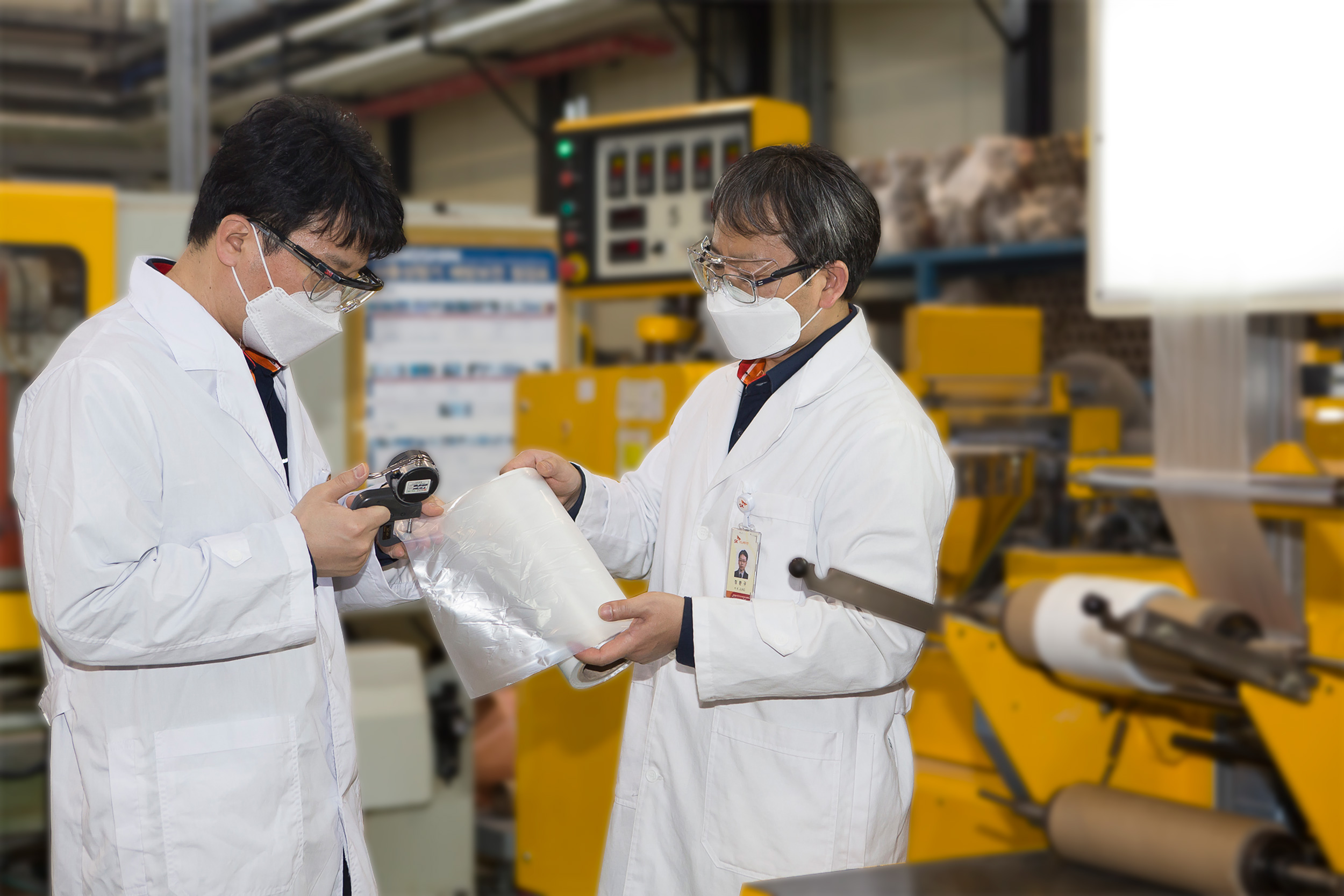 Photo 3) Researchers measure the physical properties of PBAT products jointly developed by SK Global Chemical and Kolon Industries.