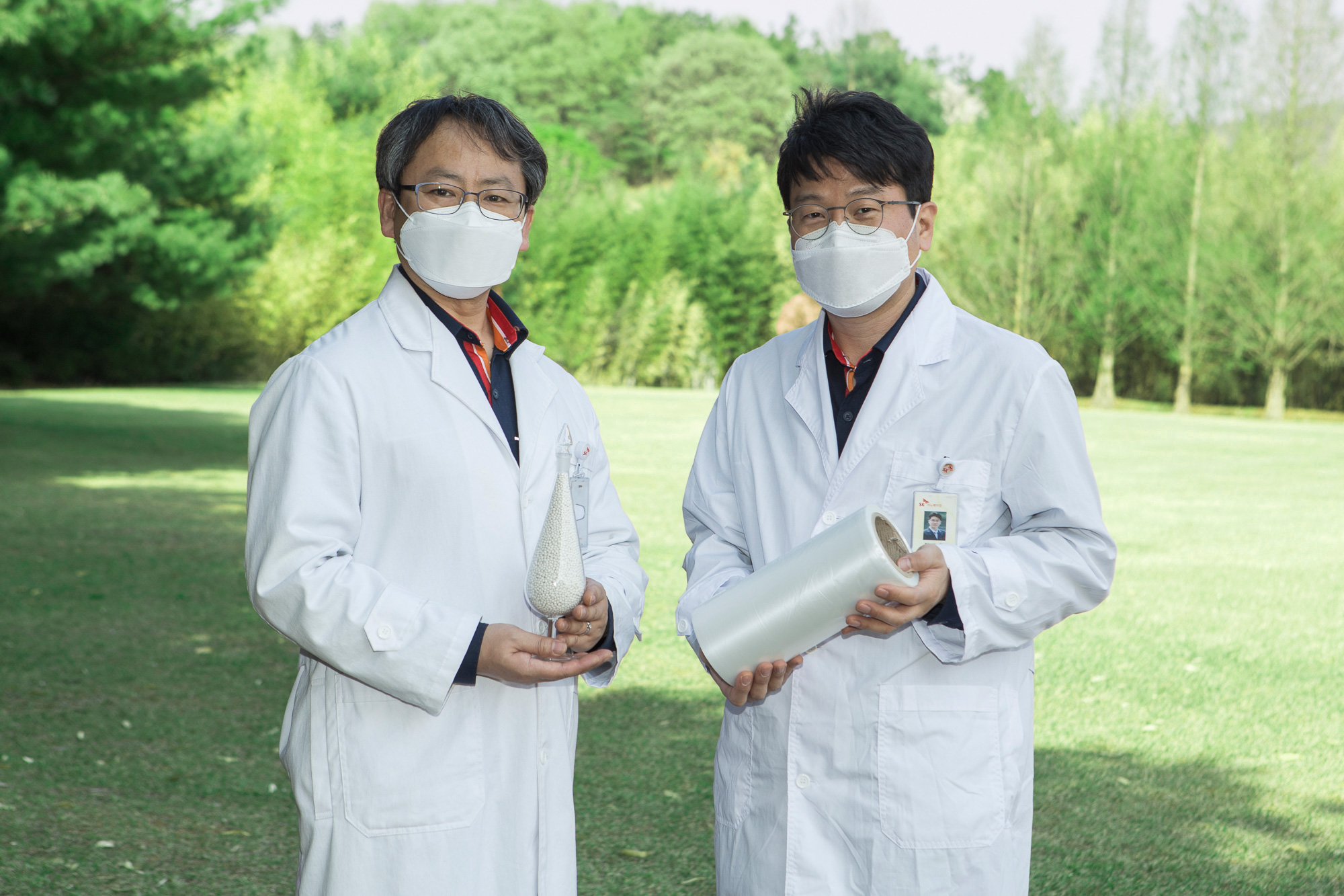 Photo 4) Researchers hold a sample of PBAT product jointly developed by SK Global Chemical and Kolon Industries.
