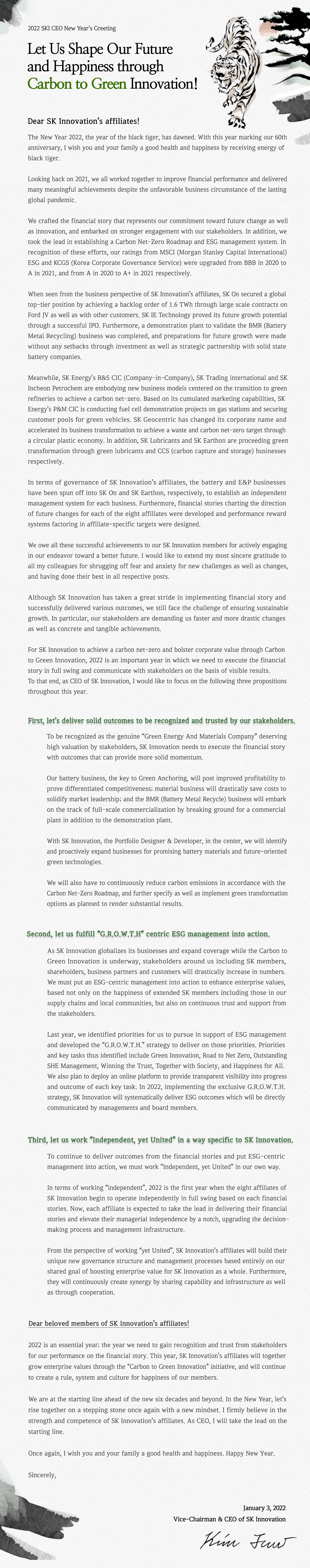 2022 SK Innovation Vice Chairman CEO New Year’s Greetings 2022. 01. 03 SKInnovation 2022 SK Innovation Vice Chairman CEO New Year’s Greetings AI Summary AI Voice Media Kit Previous Post Next Post Related Articles PRESS SK Innovation, SK On Partner with Standard Energy on Safer ESS 2026.01.06 PEOPLE & CULTURE CORPORATES [Interview] SK Innovation executives talk about plans in 2022, the first year of Financial Story execution ① SK Innovation Vice Chairman & CEO Kim Jun: “Let’s bring full-scale results as a Green Energy & Materials Company” 2022.01.26 CORPORATES PRESS CENTER SK Innovation Ulsan CLX to be the first in Korea to apply eco-friendly pyrolysis oil in refinery&petrochemical process 2021.09.30 CORPORATES INSIGHT SK Innovation’s endeavor to achieve Decarbonization by taking Green Transformation ② SK Innovation & SK Energy take the initiative in accomplishing Net Zero with CCS technology 2021.09.20