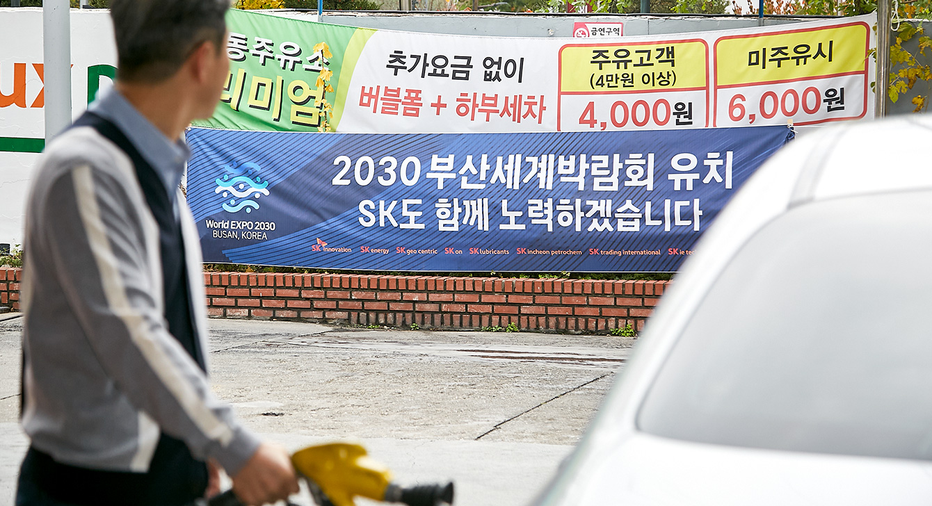 ▲ 서울 광진구 군자동주유소에서 주유 고객이 ‘2030 부산월드엑스포’ 유치를 염원하는 SK이노베이션의 응원 메시지가 담긴 홍보물을 보고 있다.