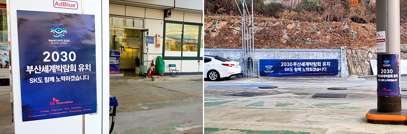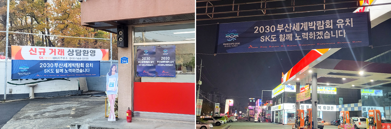 ▲ (좌) 충남 천안시 서북구 훼미리주유소 내 곳곳에 부착된 ‘2030 부산월드엑스포’ 유치 홍보물 / (우) 충남 천안시 서북구 글로벌주유소 외관에 부착되어 있는 ‘2030 부산월드엑스포’ 유치 현수막