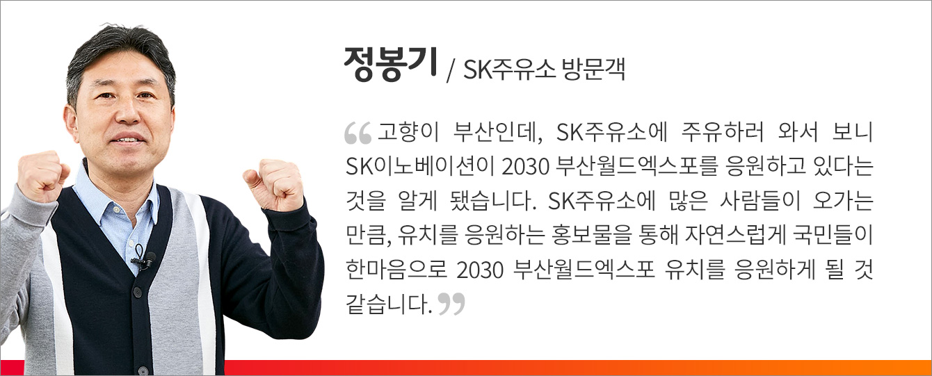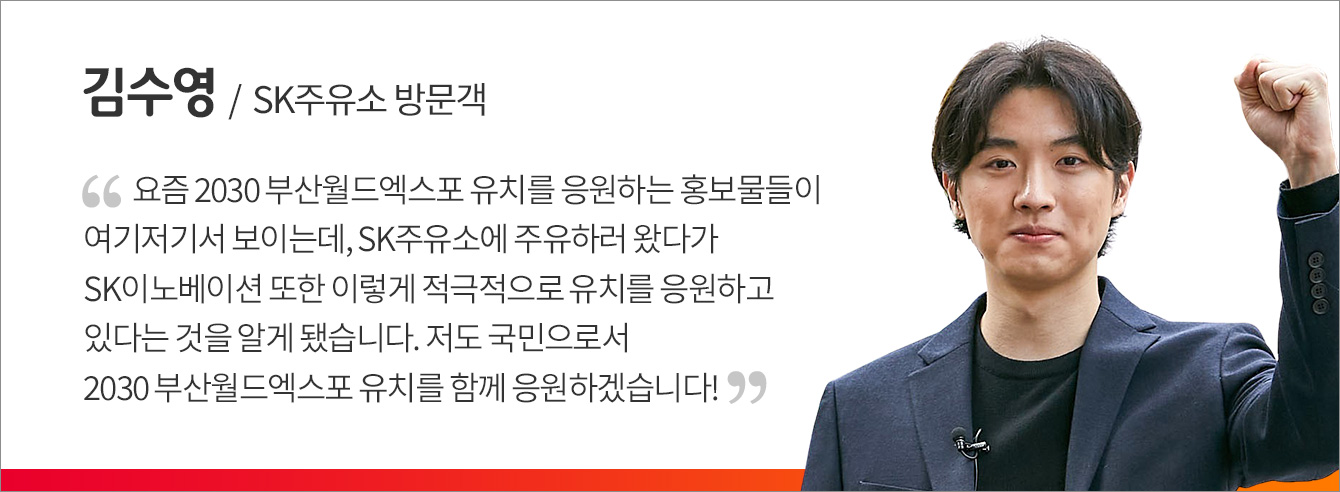 2030 부산월드엑스포를 통해 대한민국이 세계의 중심으로 성장할 수 있도록 적극적인 홍보 지원에 나선 전국 SK주유소의 모습을 사진으로 만나보자.