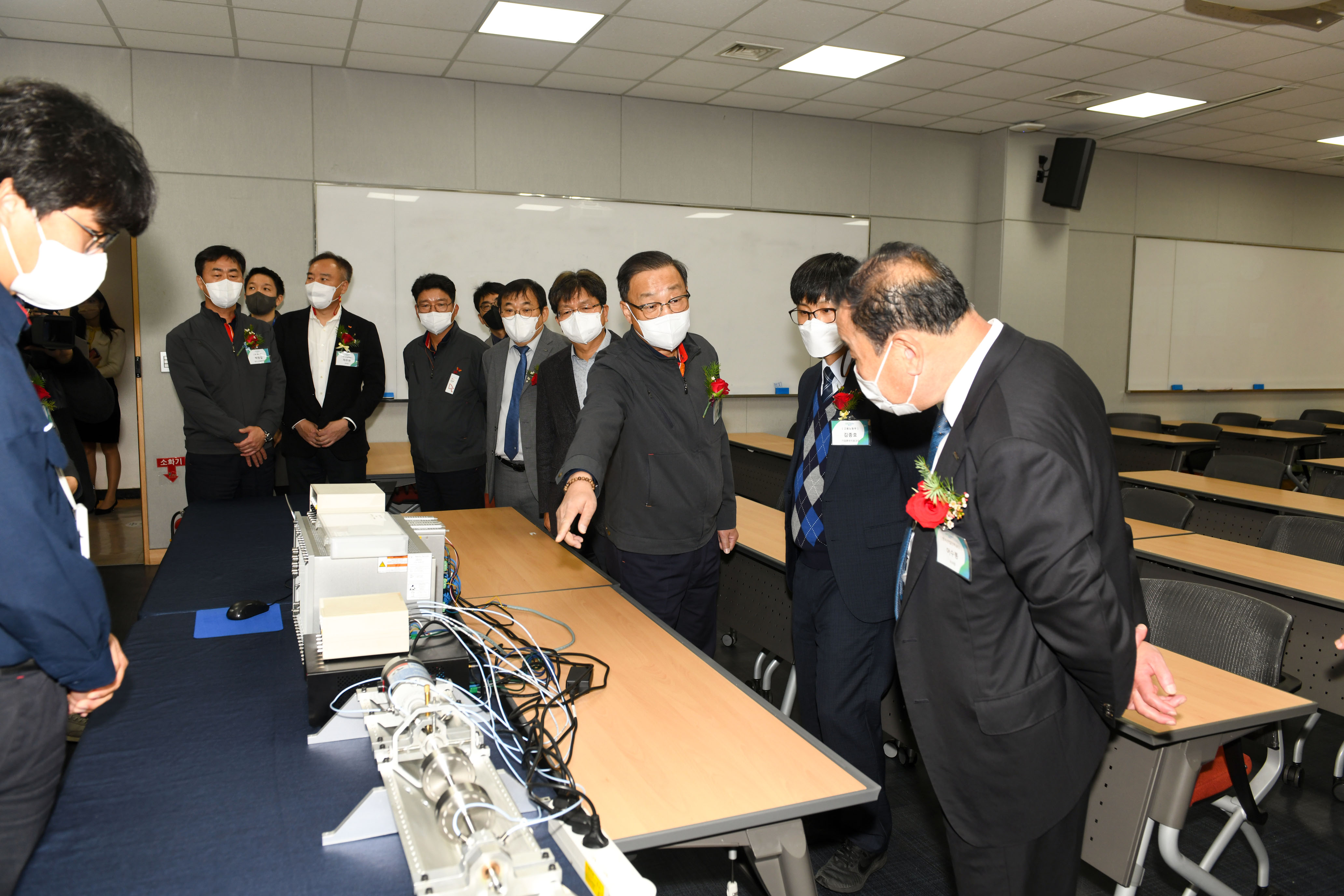 (사진3) ‘SK에너지 산업전환 공동훈련센터’ 개소식에 참석한 내빈들이 친환경•스마트 플랜트 구현을 위한 공정 시뮬레이터 S/W와 AI를 접목한 각종 첨단 장비 및 기자재 등이 구비된 강의 시설을 시찰하고 있다.