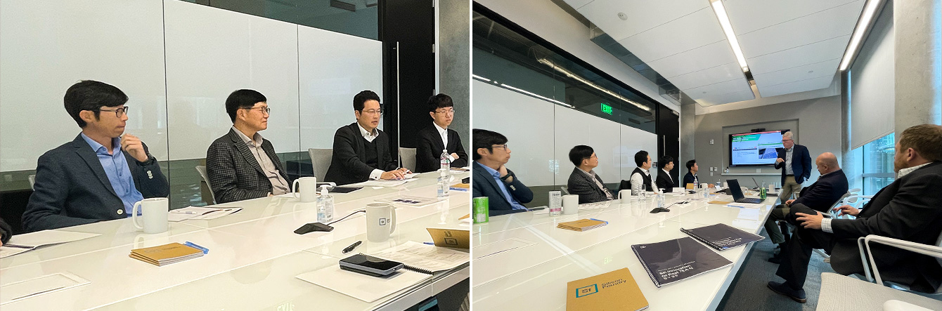 ▲ (좌) 11월 15일(현지 시간), 미국 샌프란시스코 실리콘밸리에 위치한 글로벌 혁신 자문기업 SiF社의 본사에서 열린 OI Post 개소식 이후 이어진 세미나에 참석한 SK이노베이션 이성준 환경과학기술원장(왼쪽에서 두 번째) / (우) SK 관계자들과 美 업계 전문가들이 세미나를 진행하고 있다.