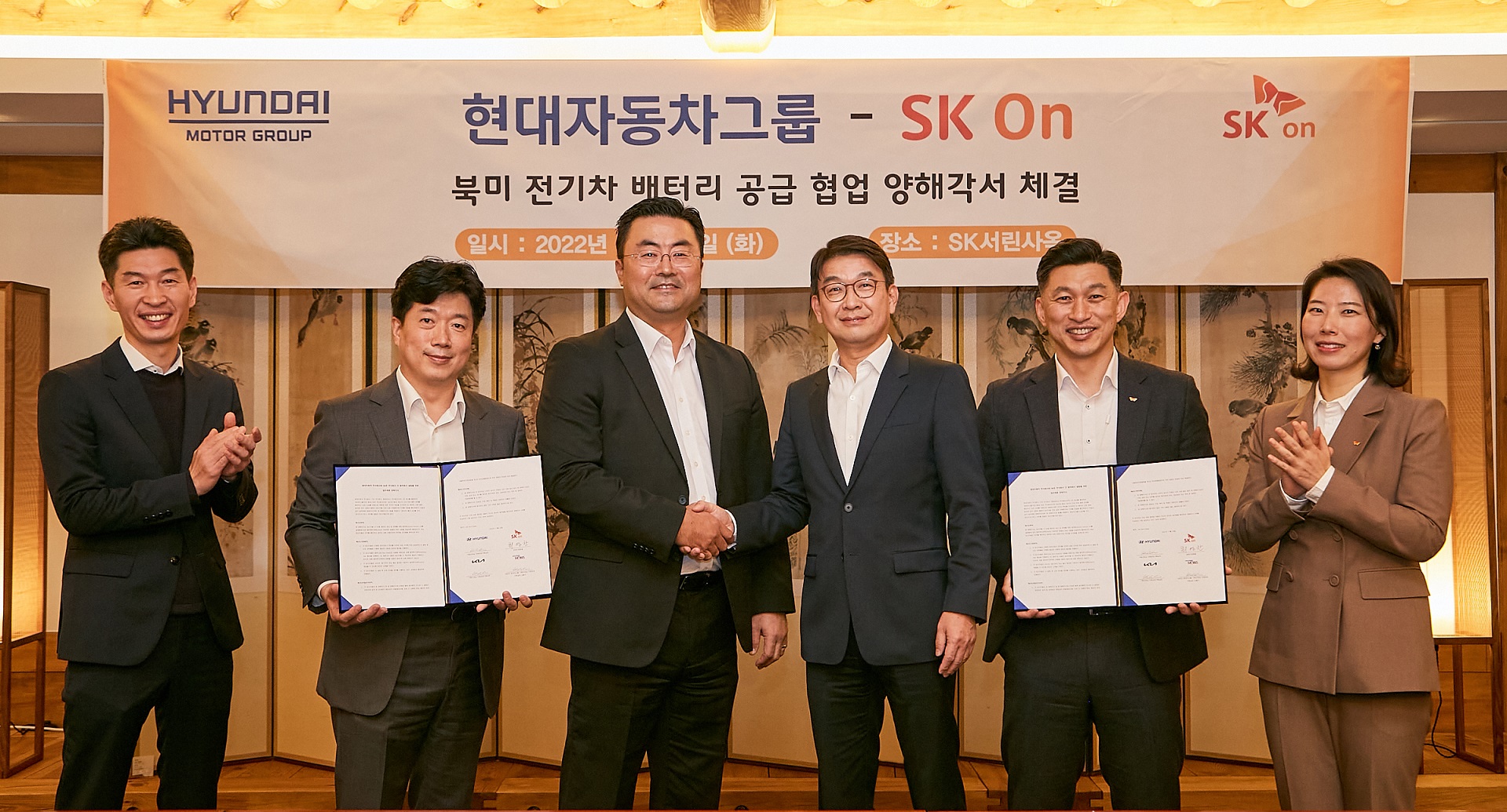 (사진 2) 최영찬 SK온 경영지원총괄(오른쪽 세번째)과 김흥수 현대차그룹 기획조정실 미래성장기획실장⋅EV사업부장(오른쪽 네번째) 등 양사 관계자들이 29일 오후 서울 종로구 SK서린사옥에서 ‘북미 전기차 배터리 공급 협업’ 양해각서를 체결하고 있다. (사진 왼쪽부터 황순현 현대차그룹 기획조정실 미래성장2팀 책임, 손창업 실장, 김흥수 부사장, 최영찬 SK온 경영지원총괄, 김철호 글로벌얼라이언스 담당, 남효주 PL)
