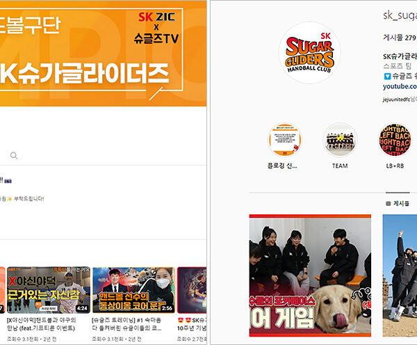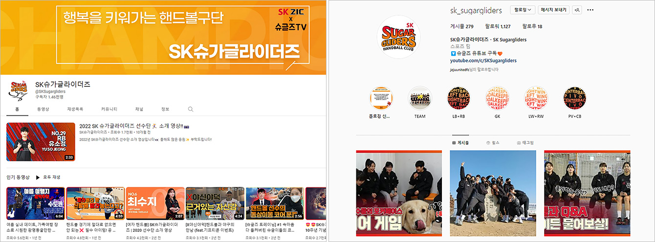 ▲ (좌) SK엔무브 핸드볼구단 윤석준 PM이 관리하는 SK슈가글라이더즈 공식 유튜브(https://bit.ly/3FgX6BK) 페이지와 (우) 인스타그램 페이지(https://bit.ly/3EZR5IC)