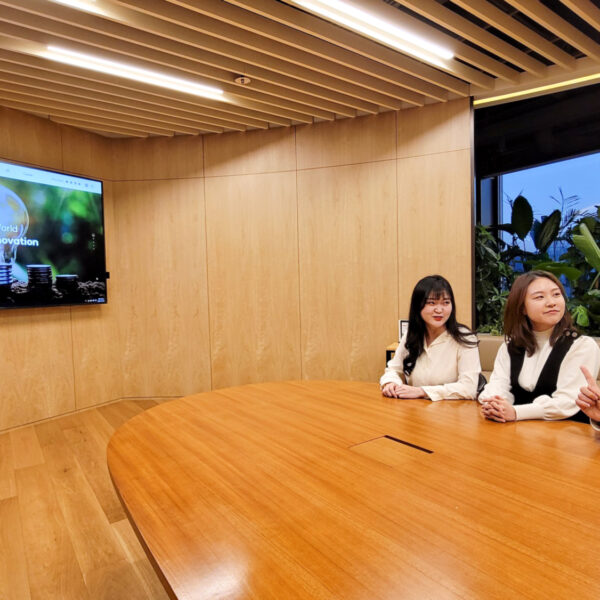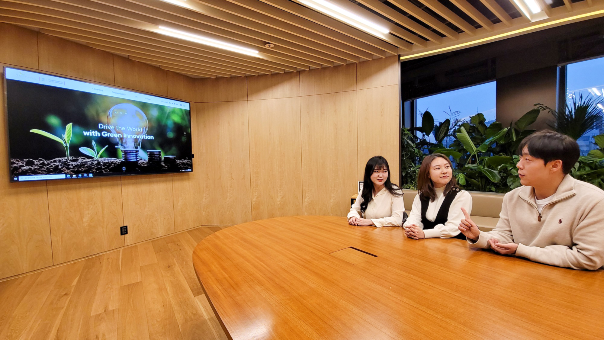(사진 1) SK이노베이션 구성원들이 서울 종로구 SK서린빌딩에서 SK이노베이션의 새 홈페이지를 보고 있다.