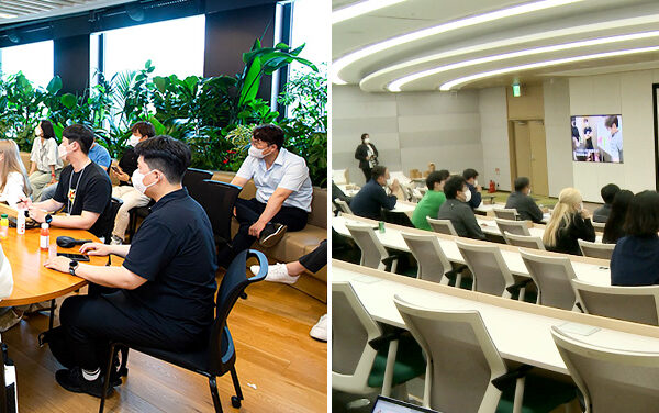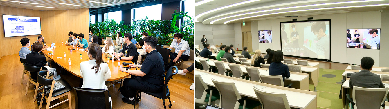 ▲ (좌) 지난 7월, 행복공간 Clan 구성원들이 SK서린빌딩 시설을 탐방 후 토의를 하고있다. / (우) 행복공간 Clan 구성원들이 4차 워크숍에서 그동안의 활동기록을 시청하고 있다.