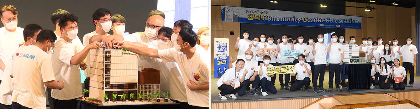 ▲ (좌) 지난 7월 12일, SK이노베이션 울산CLX 내 본관 하모니홀에서 진행된 행복CC Celebration에서 행복CC 런칭을 선언했다. / (우) 지난 7월 12일, SK이노베이션 울산CLX 내 본관 하모니홀에서 진행된 행복CC Celebration에서 단체 사진을 촬영하고 있다.
