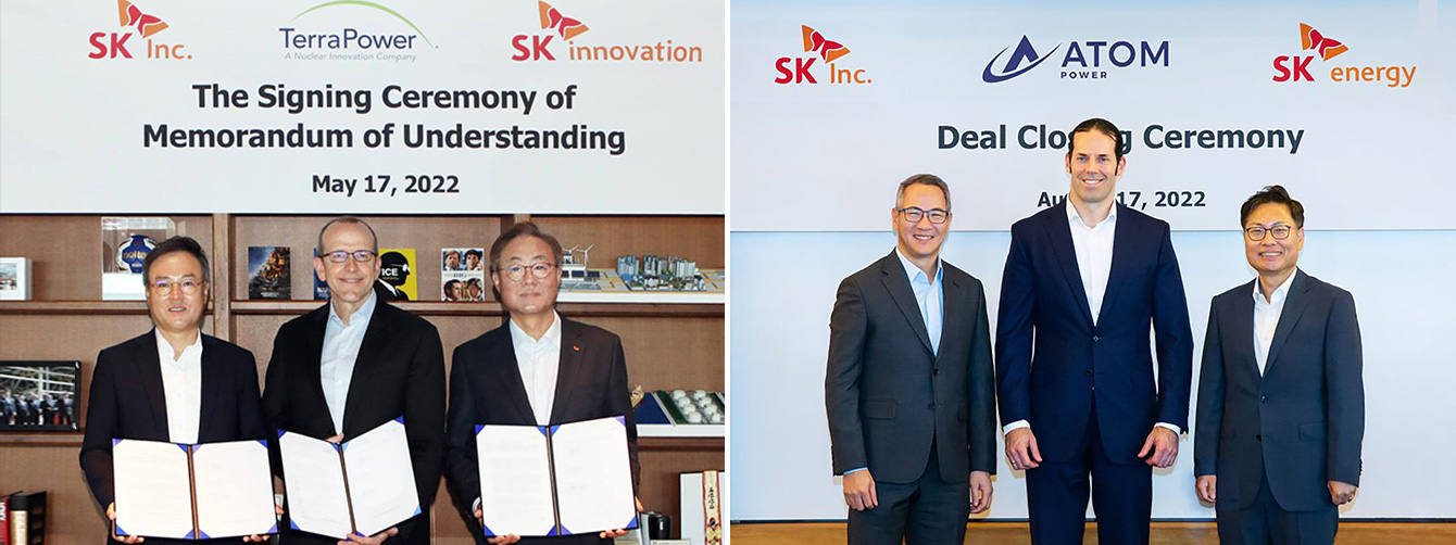 ▲ (좌) 2022년 5월, 서울시 종로구 SK 서린빌딩에서 (왼쪽부터) 장동현 SK주식회사 부회장, 크리스 르베크 미국 테라파워(Terra Power) CEO, 김준 SK이노베이션 부회장이 포괄적 사업협력을 위한 양해각서 체결 기념 촬영을 하고 있다. / (우) 2022년 8월, 서울시 종로구 SK 서린빌딩에서 (왼쪽부터) 김무환 SK주식회사 Green투자센터장, 라이언 케네디(Ryan Kennedy) 아톰파워(Atom Power Inc.) CEO, 강동수 SK에너지 S&P추진단장이 관계자들이 참석한 가운데 SK 측의 아톰파워 인수 절차를 마무리하는 행사에서 기념 촬영을 하고 있다.