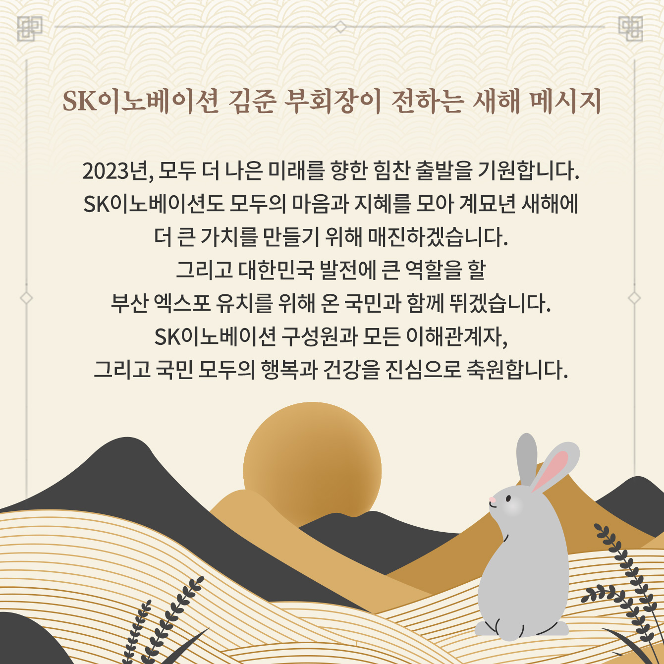 2023년 1월 1일을 밝히는 계묘년(癸卯年) 첫 태양이 떠올랐다. SK이노베이션은 ‘지혜’를 상징하는 검은 토끼처럼, 이해관계자 모두가 지혜롭게 어려움을 헤쳐나가며 더 많은 성과를 거두는 한 해가 되길 바라는 마음으로 첫 일출 랜선 관람 행사를 준비했다. 지난 4년간 SK이노베이션 울산Complex에서 새해 첫 일출을 중계해 온 SK이노베이션이, 올해는 제2의 수도 부산에서 새해 첫 일출을 언택트 생중계로 진행하며 시민들과 새해 소망을 빌고 행복을 나눴다.