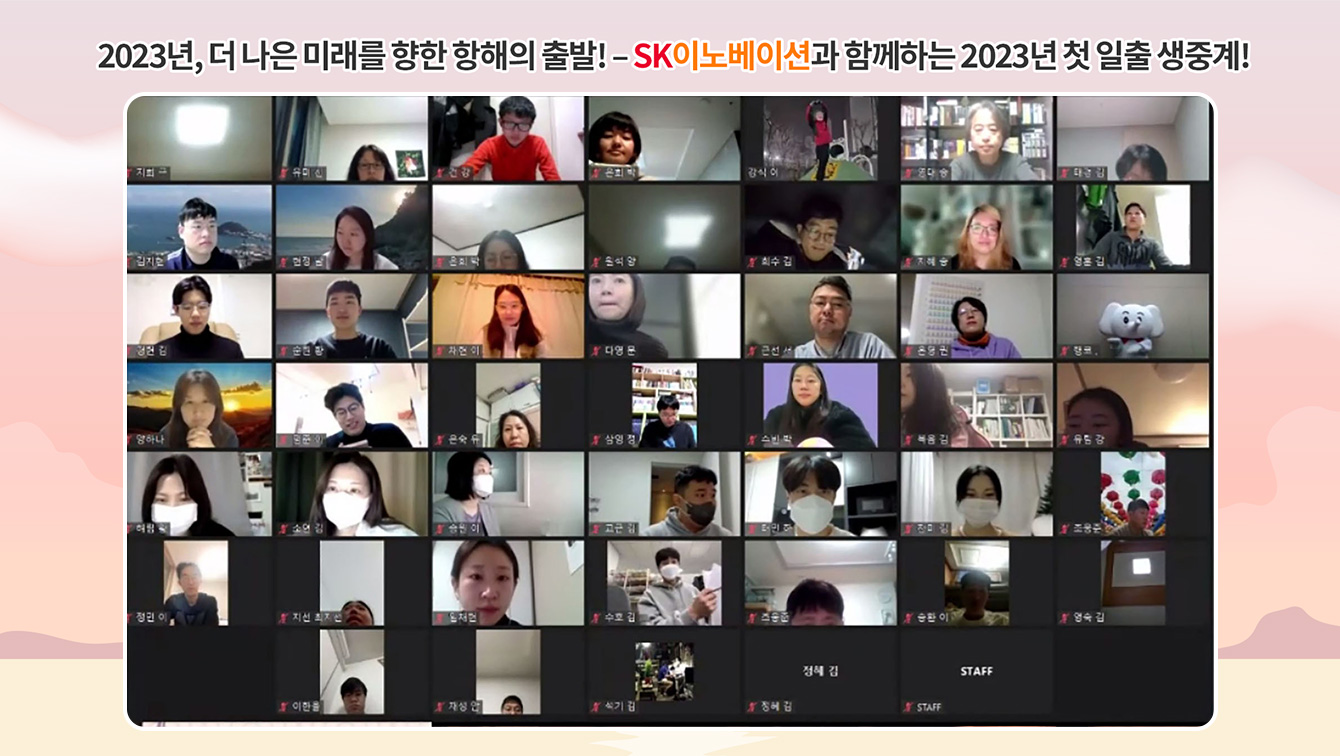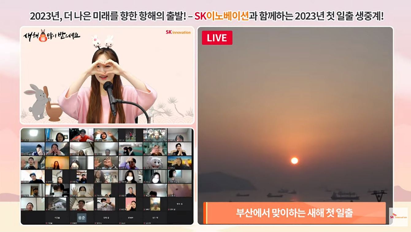 ▲ SK이노베이션 공식 유튜브 채널에서 3원 생중계로 진행된 일출 행사 ‘2023년, 더 나은 미래를 향한 항해의 출발!’에 화상으로 함께한 일반인 참여자들