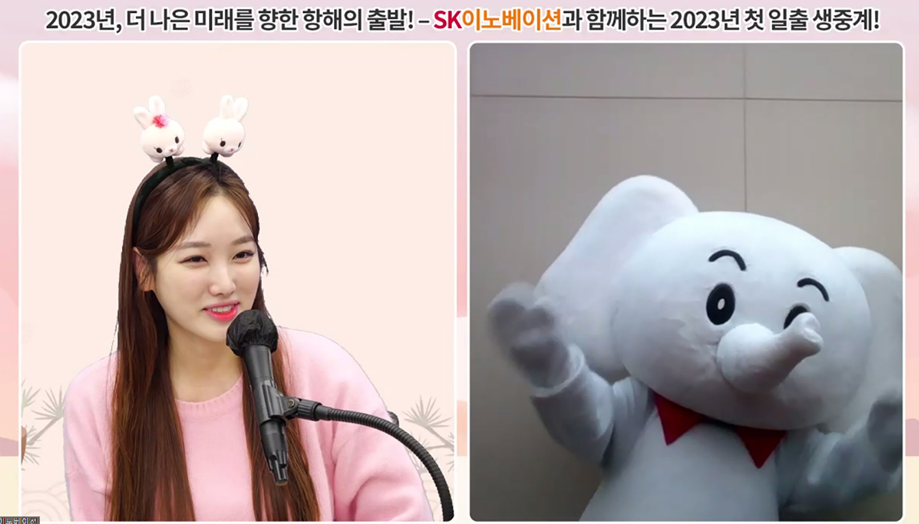▲ SK이노베이션 공식 유튜브 채널에서 3원 생중계로 진행된 언택트 일출 행사 ‘2023년, 더 나은 미래를 향한 항해의 출발!’에서 지구환경을 생각하는 행복코끼리 ‘행코’가 새해 소망을 빌고 있다.