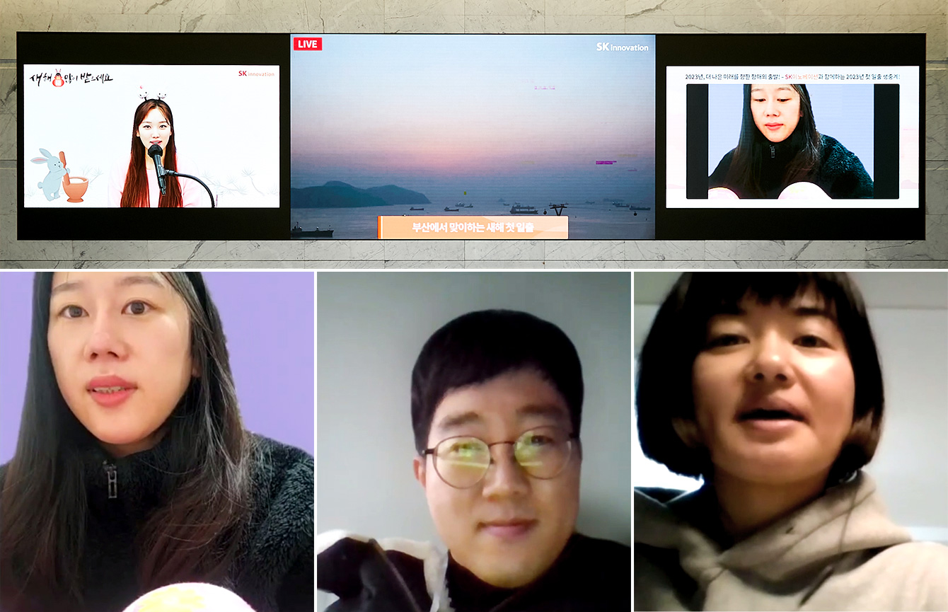 ▲ (좌) SK이노베이션 공식 유튜브 채널에서 3원 생중계로 진행된 일출 행사 ‘2023년, 더 나은 미래를 향한 항해의 출발!’에 화상으로 함께한 일반인 참여자들이 새해 소망을 빌고 있다. (아래 왼쪽부터 박수빈, 김희수, 박은희氏)
