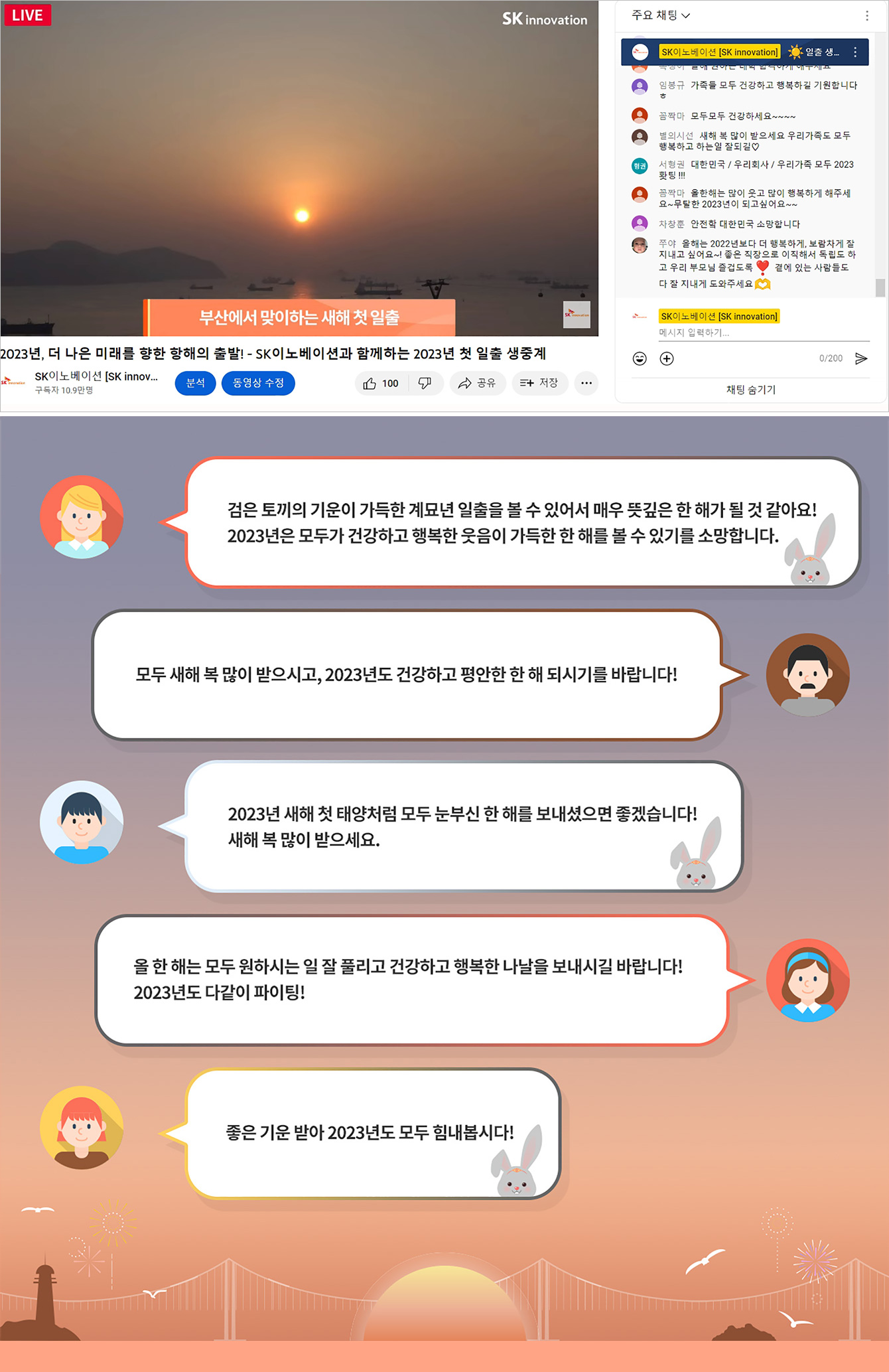 이날 일출 생중계는 화상 참여자 49명과 온라인 시청자 약 팔천여명도 랜선으로 함께 일출 행사에 참여하며 SK이노베이션과 새해를 맞이했다. 생중계에 참여하지 못한 시청자들은 유튜브 생중계 댓글을 통해 “2023년 우리 가정의 건강과 행복을 빕니다”, “SK이노베이션 일출 생중계 덕분에 계묘년 첫 태양을 볼 수 있어서 매우 기쁩니다”, “부산에서 떠오르는 태양처럼 모두 희망찬 하루를 보내시길 바랍니다”, “2030 부산엑스포 유치 파이팅!” 등의 소감을 유튜브 채팅창에 남겼다.
