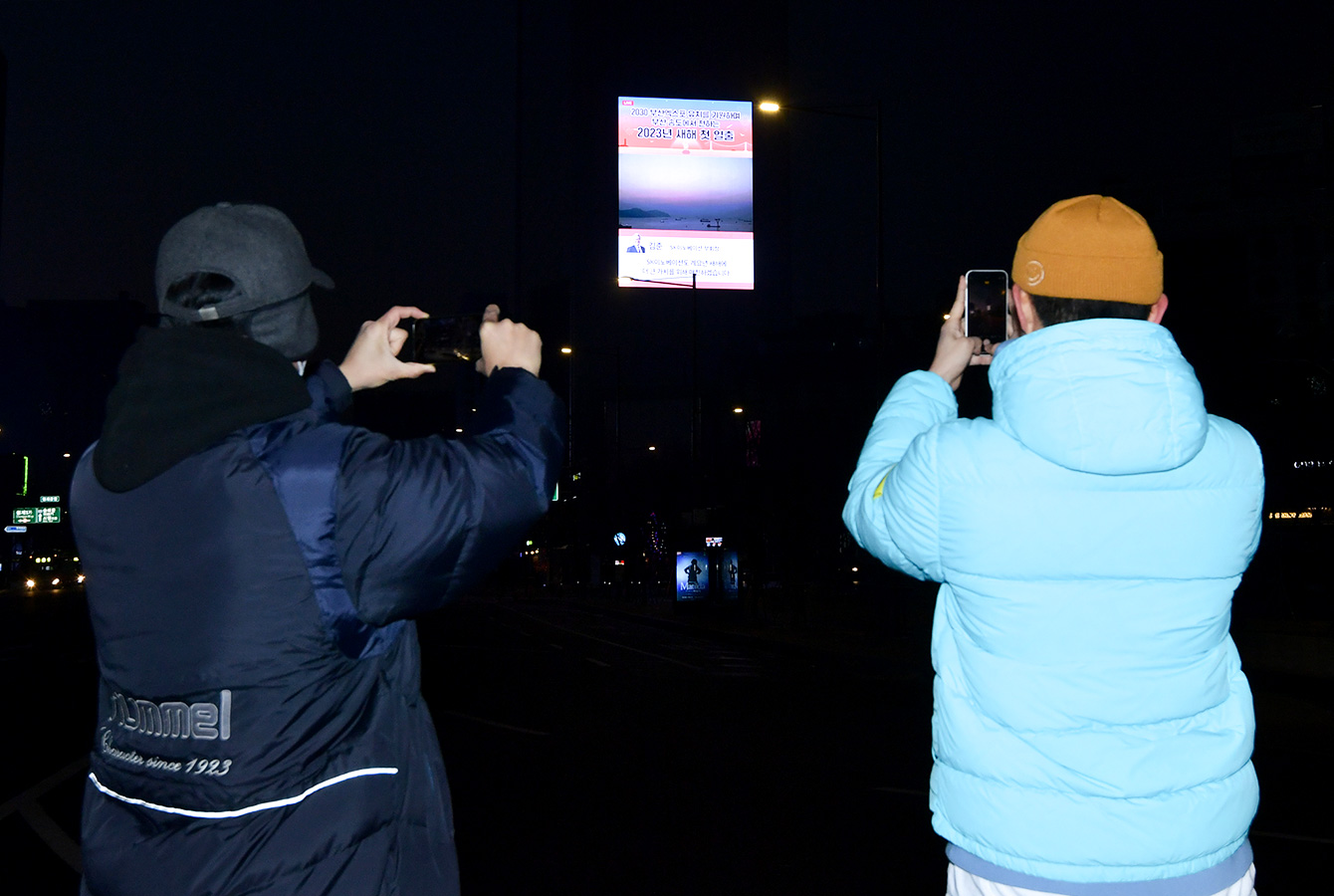 추운 새벽, 바쁘게 길을 나서던 시민들은 가던 길을 멈추고 대형 전광판에 생중계된 일출 장면을 감상하며 2023년을 맞이했다.