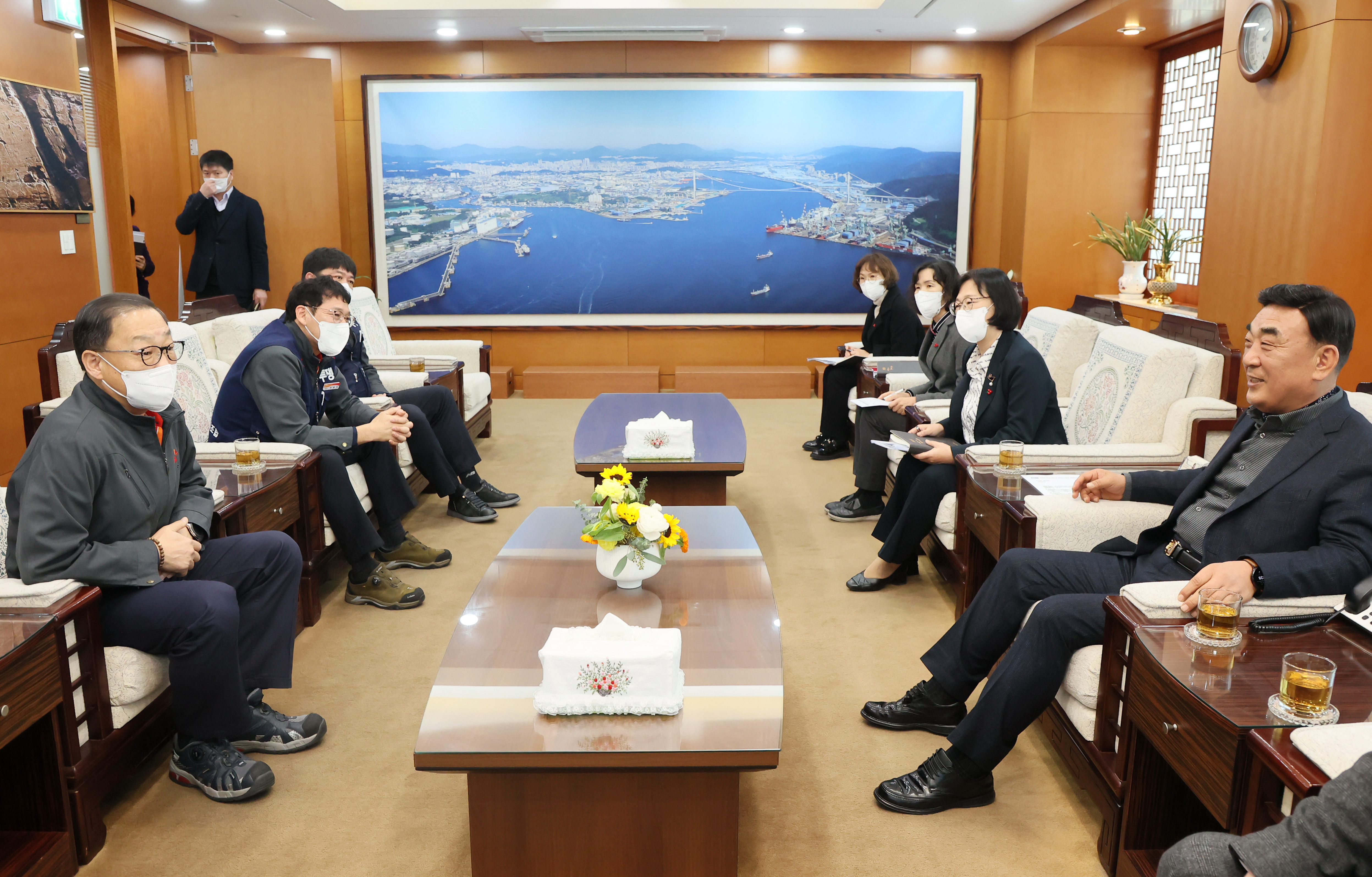 (사진 2, 3) SK이노베이션 울산Complex가 1월 11일, 울산광역시청에서 열린 전달식을 통해 울산 지역 저소득층 및 취약계층을 위해 이웃사랑성금 20억원을 기탁했다. 성금 전달식 전 행사 참석자들이 환담을 나누고 있다.