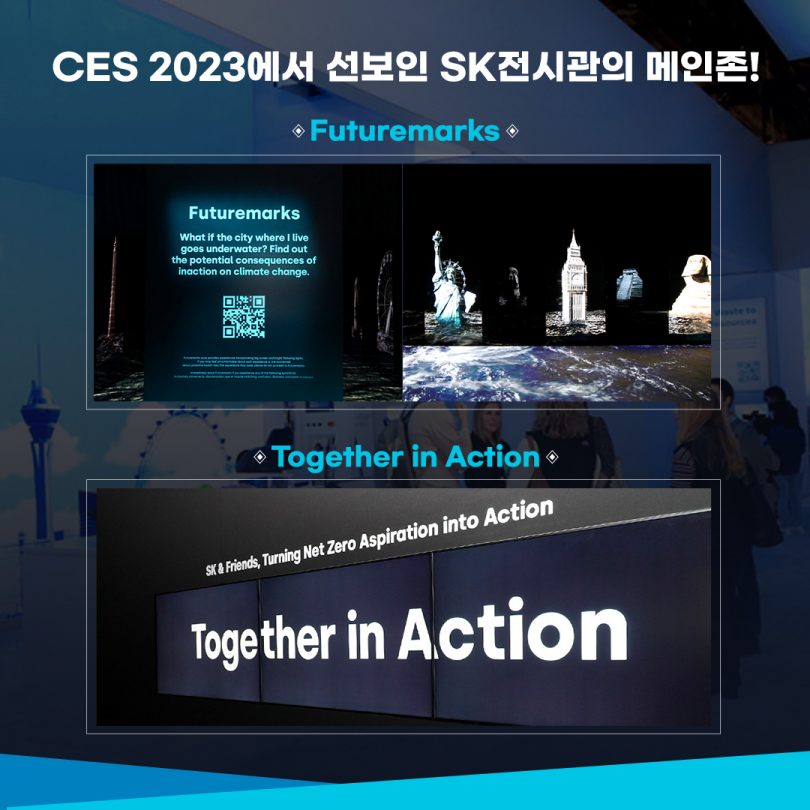 SK그룹과 SK이노베이션은 CES 2023에서 ‘행동(함께, 더 멀리, 탄소 없는 미래로 나아가다)’을 주제로 SK 전시관을 선보였다.