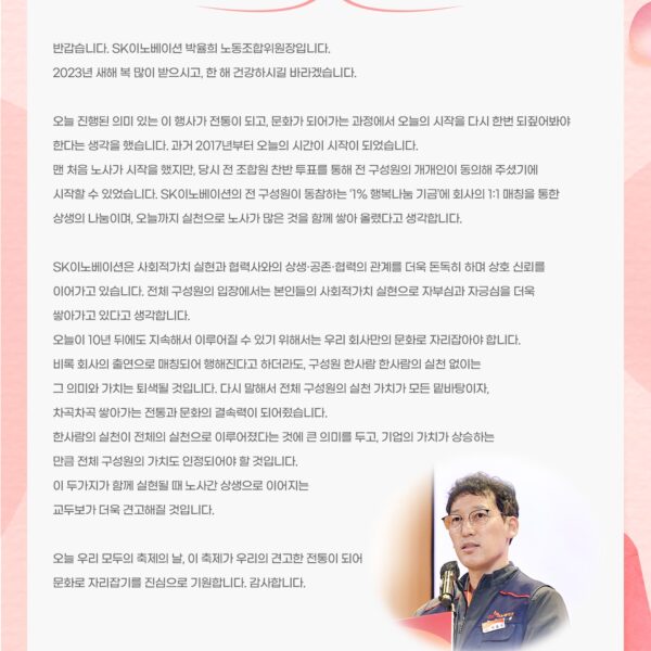 ‘상생과 동행의 약속’으로 함께 나아가고 있는 SK이노베이션과 협력사에 대한 박율희 SK이노베이션 노동조합위원장의 인사말을 들어본다.
