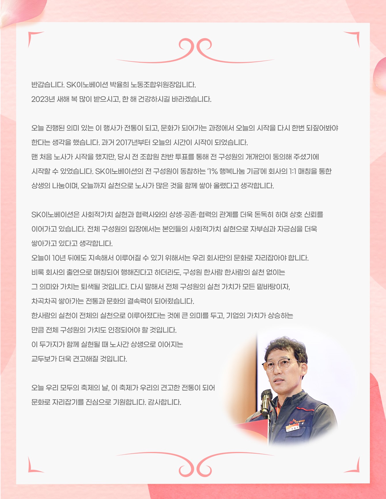 ▲ 지난 1월 17일, 울산 남구 SK이노베이션 울산Complex 하모니홀에서 열린 ‘2023 SK이노베이션 협력사 상생기금 전달식’에서 기념사하고 있는 박율희 SK이노베이션 노동조합위원장