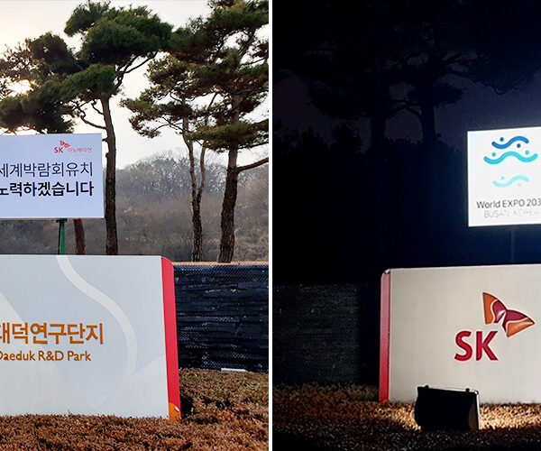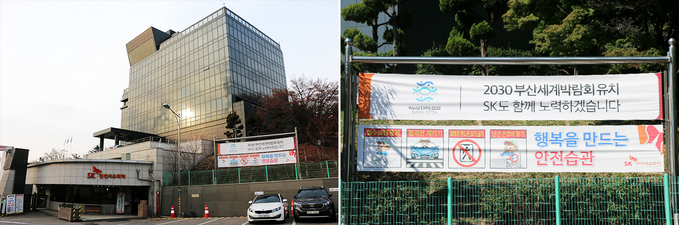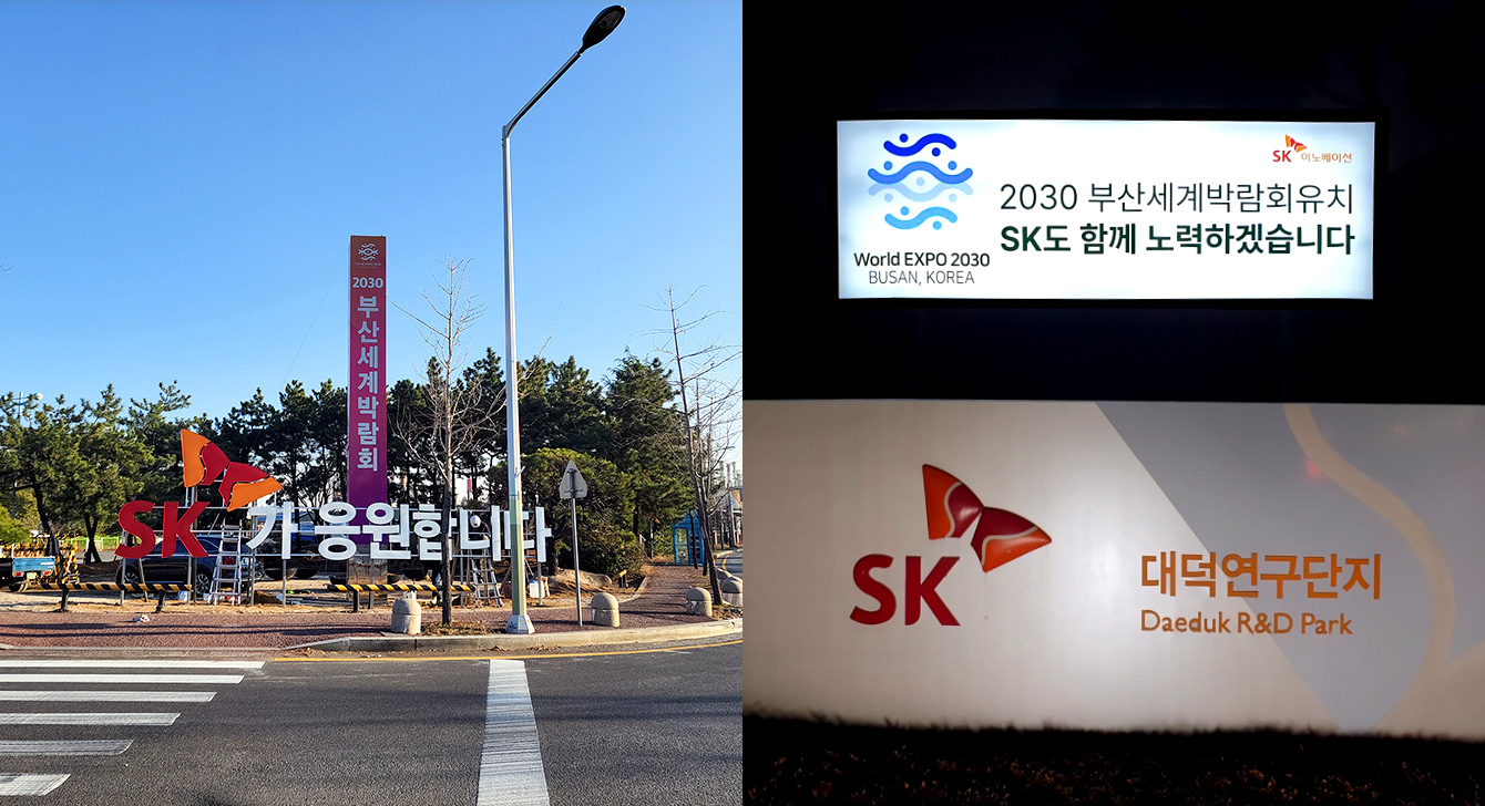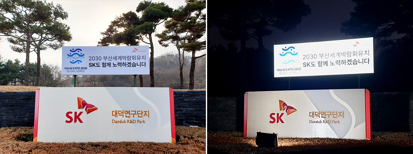 대전 유성구에 위치한 SK이노베이션 계열 R&D의 산실, 환경과학기술원의 진입로에는 부산세계박람회 유치를 기원하는 대형 사인 보드가 설치됐다. 차량 이동량이 많은 진입로에 세워졌기에 이 곳을 오가는 대전 시민들의 이목을 집중시키며 홍보 효과를 톡톡히 누리고 있다.