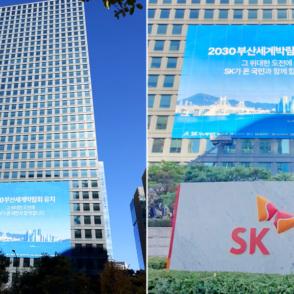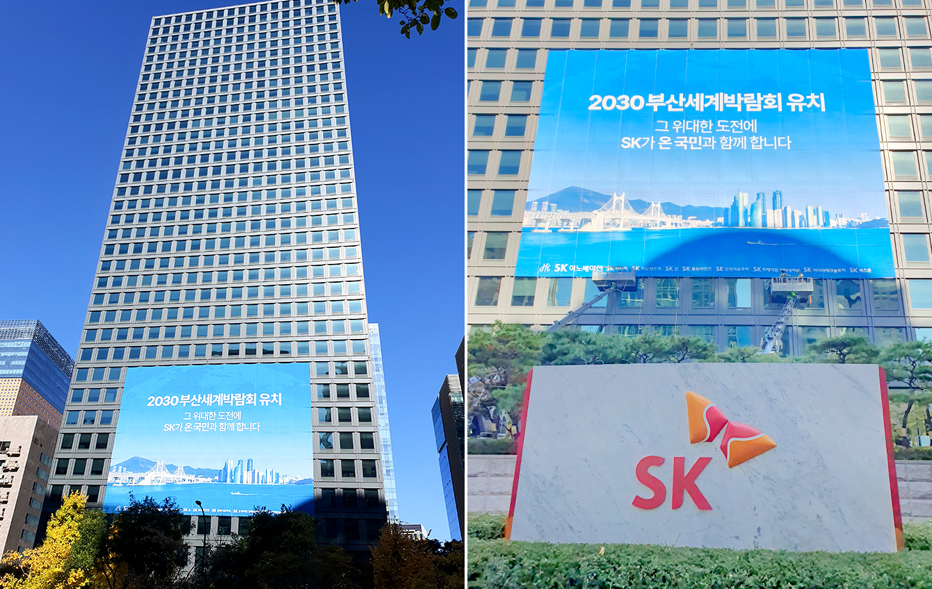 SK이노베이션이 서울 본사를 비롯한 울산, 인천, 대전 등 지역 사업장을 기점으로 2030 부산세계박람회 유치 기원 홍보물을 설치하며 올해에도 응원 활동을 적극적으로 전개하고 있다.