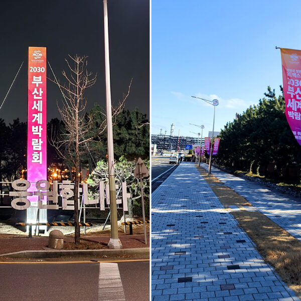 ▲ SK이노베이션 울산Complex 정문 앞 삼거리(좌측) 및 진입로(우측)에 설치된 SK이노베이션의 2030 부산세계박람회 유치 기원 홍보물