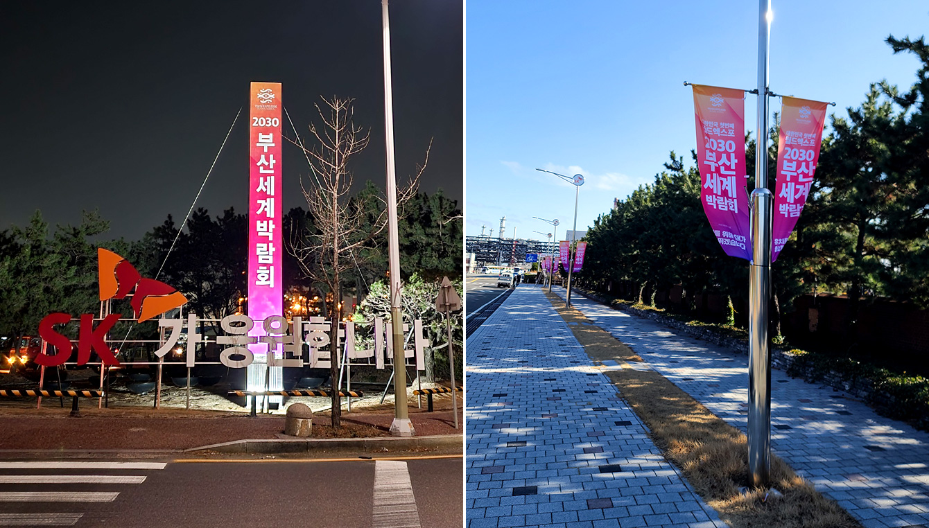 ▲ SK이노베이션 울산Complex 정문 앞 삼거리(좌측)와 대전 유성구에 위치한 SK이노베이션 환경과학기술원 진입로(우측)에 설치된 SK이노베이션의 2030 부산세계박람회 유치 기원 홍보물