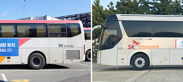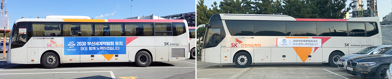 ▲ SK이노베이션의 2030 부산세계박람회 유치 기원 홍보물이 부착된 울산CLX(좌측) 및 SK인천석유화학(우측)의 구성원 출퇴근용 셔틀버스