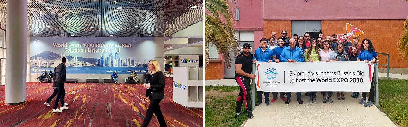 ▲ (좌) 2030 부산세계박람회 유치를 기원하는 SK이노베이션의 대형 현수막이 게시된 CES 2023 행사장(미국 라스베이거스 컨벤션 센터)을 관람객들이 지나가고 있다. / (우) SK이노베이션의 자회사 SK지오센트릭의 해외 사업장 SK프리마코 유럽(스페인 타라고나 위치) 구성원들이 2030 부산세계박람회 유치를 응원하고 있다.