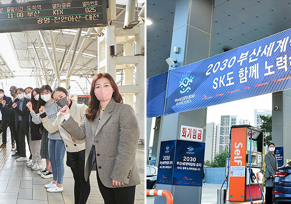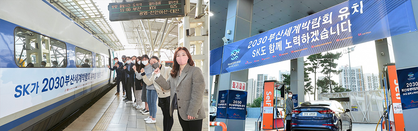 ▲ (좌) 2022년 11월, SK이노베이션 구성원들이 KTX 래핑열차 앞에서 2030 부산세계박람회 유치를 응원하고 있다. / (우) SK이노베이션의 2030 부산세계박람회 유치 기원 현수막이 걸린 인천광역시 중구 소재 SK 스카이파크 주유소
