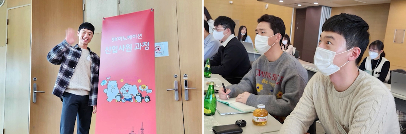 ▲ (우) SK무의연수원에서 신입사원 교육 과정을 듣고 있는 김민수 PM(가장 오른쪽)