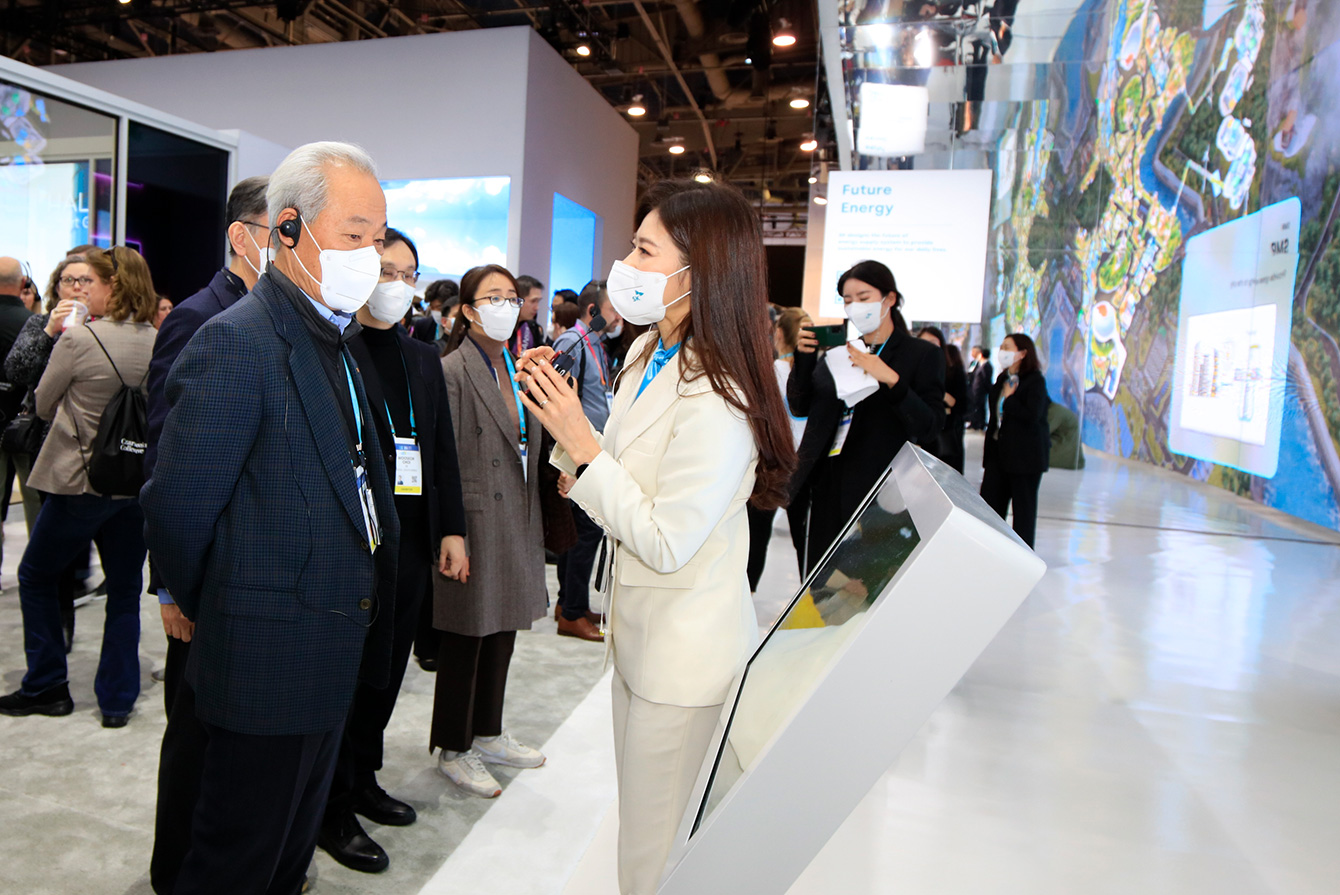 ▲ SK이노베이션 김종훈 이사회 의장이 지난 1월 6일(현지 시간), 미국 라스베이거스에서 열린 CES 2023 현장에서 SK 전시관을 둘러보고 있다.