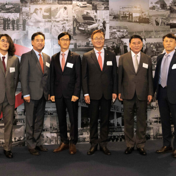 ▲ 지난해 10월 진행된 SK이노베이션 60주년 행사에 참여한 SK이노베이션 김준 부회장(사진 왼쪽에서 네 번째)과 SK에너지 조경목 사장(사진 왼쪽에서 세 번째)이 기념 사진을 촬영하고 있다.