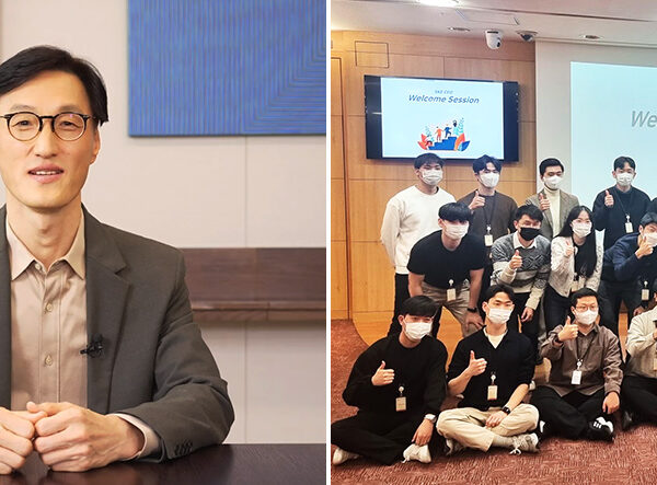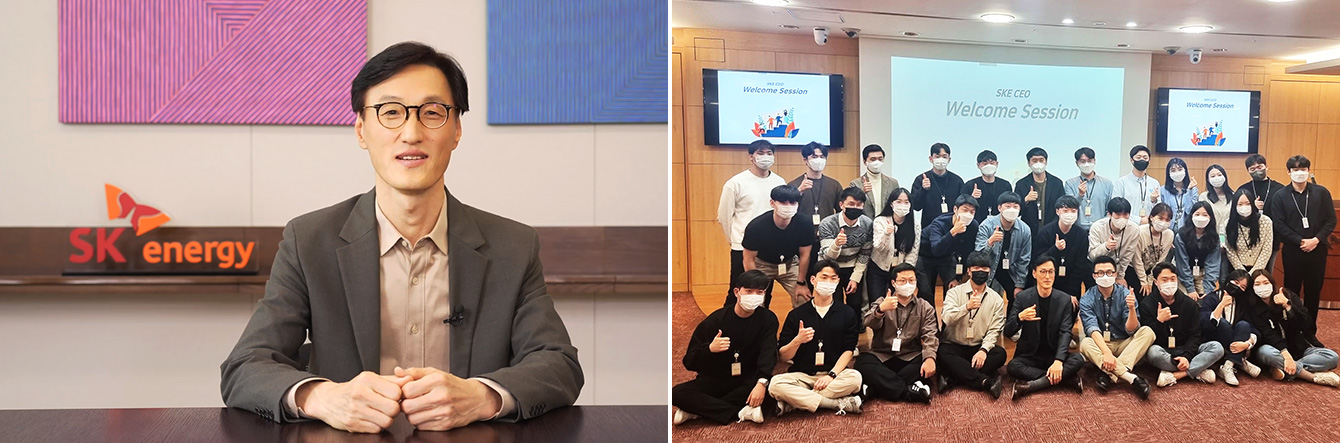 ▲ (좌) 올해 초 진행된 SK이노베이션 계열 신입사원 과정 ‘CEO와의 대화’에서 SK에너지 조경목 사장이 신입사원에게 격려와 당부의 메시지를 전하고 있다. / (우) 올해 초 신입사원 환영식에 참여한 SK에너지 조경목 사장이 단체 기념사진을 촬영하고 있다.