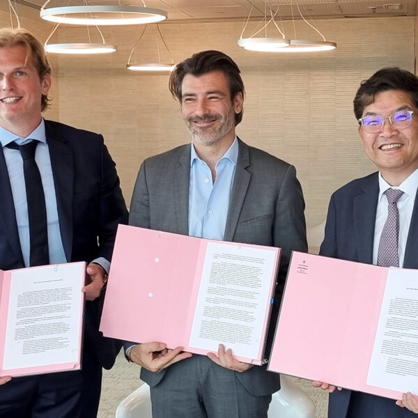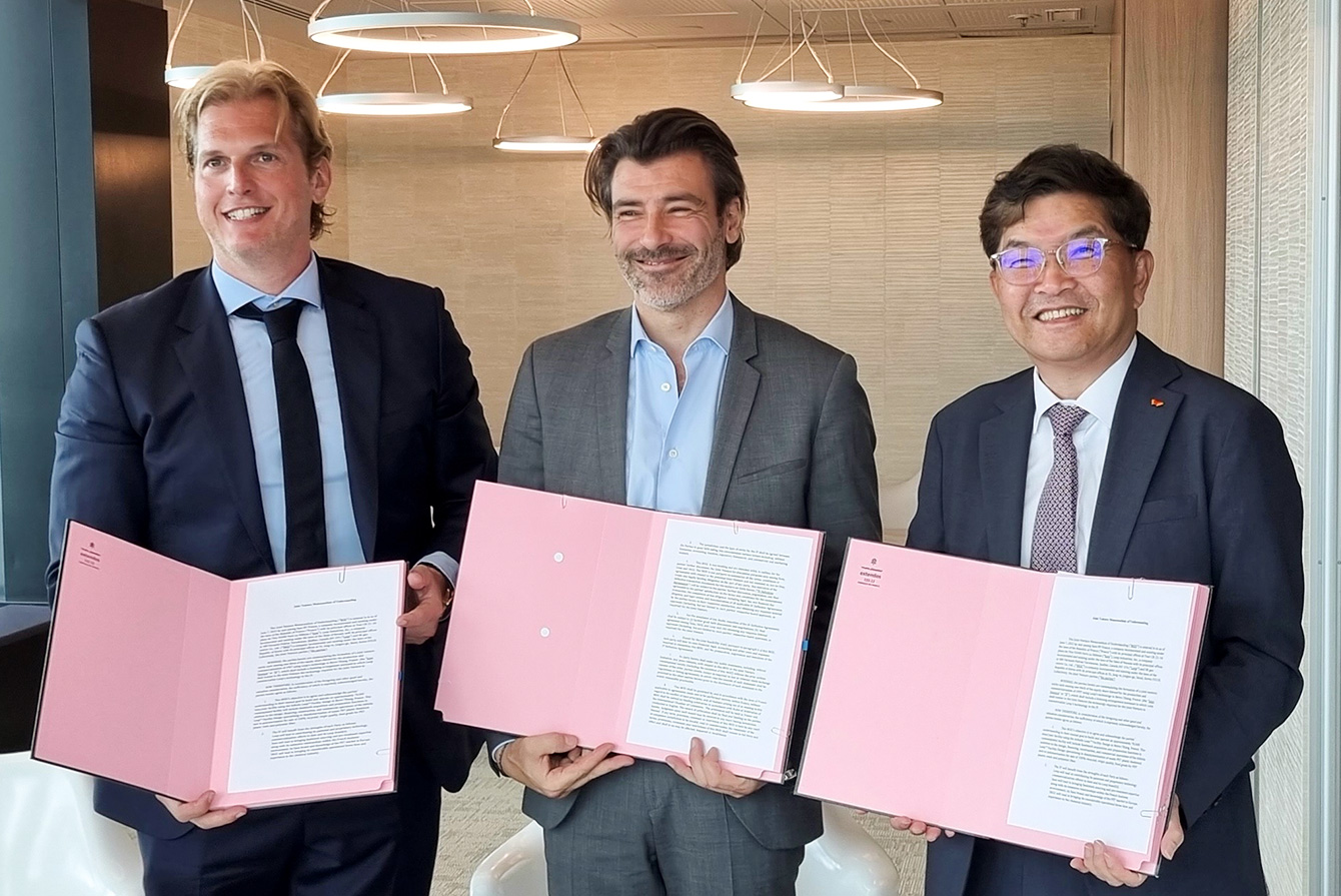 ▲ 작년 6월 프랑스 수에즈 본사에서 플라스틱 재활용 합작법인 설립을 위한 양해각서를 체결했다. (왼쪽부터) 루프인더스트리 CEO 대니얼 솔로미타(Danniel Solomita), 수에즈 부사장 맥스 펠레그리니(Max Pellegrini), SK지오센트릭 나경수 사장